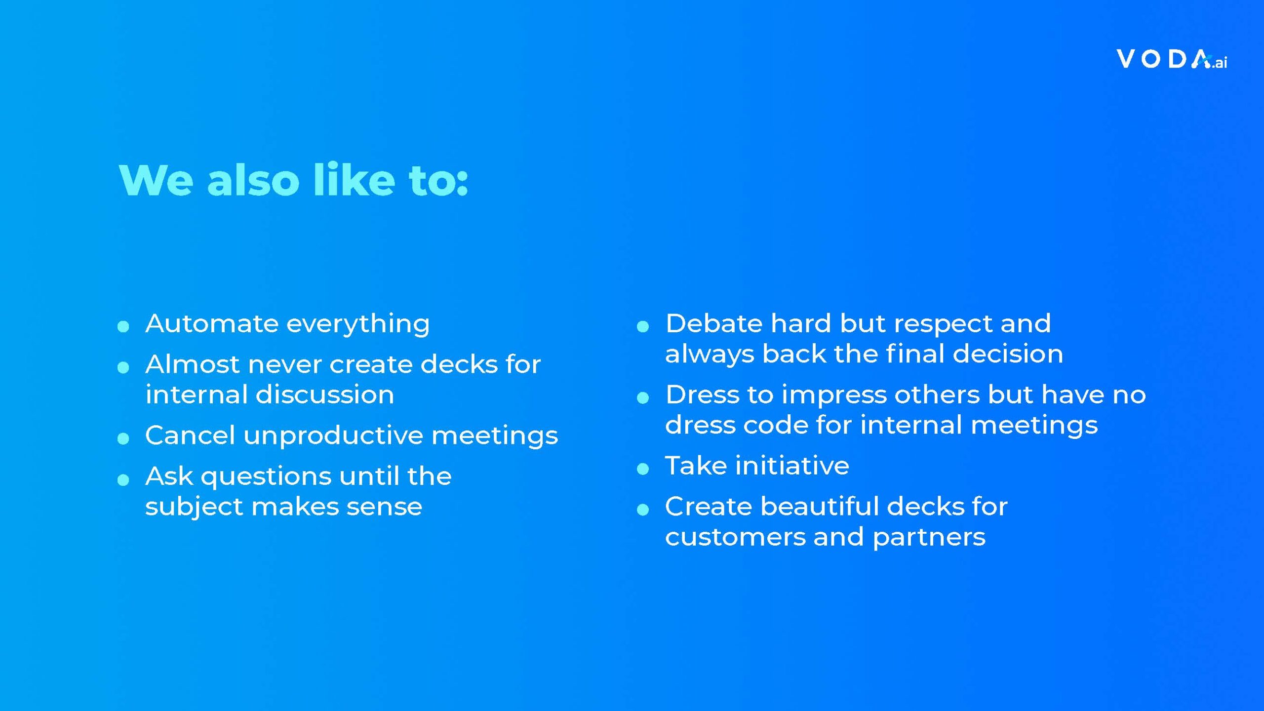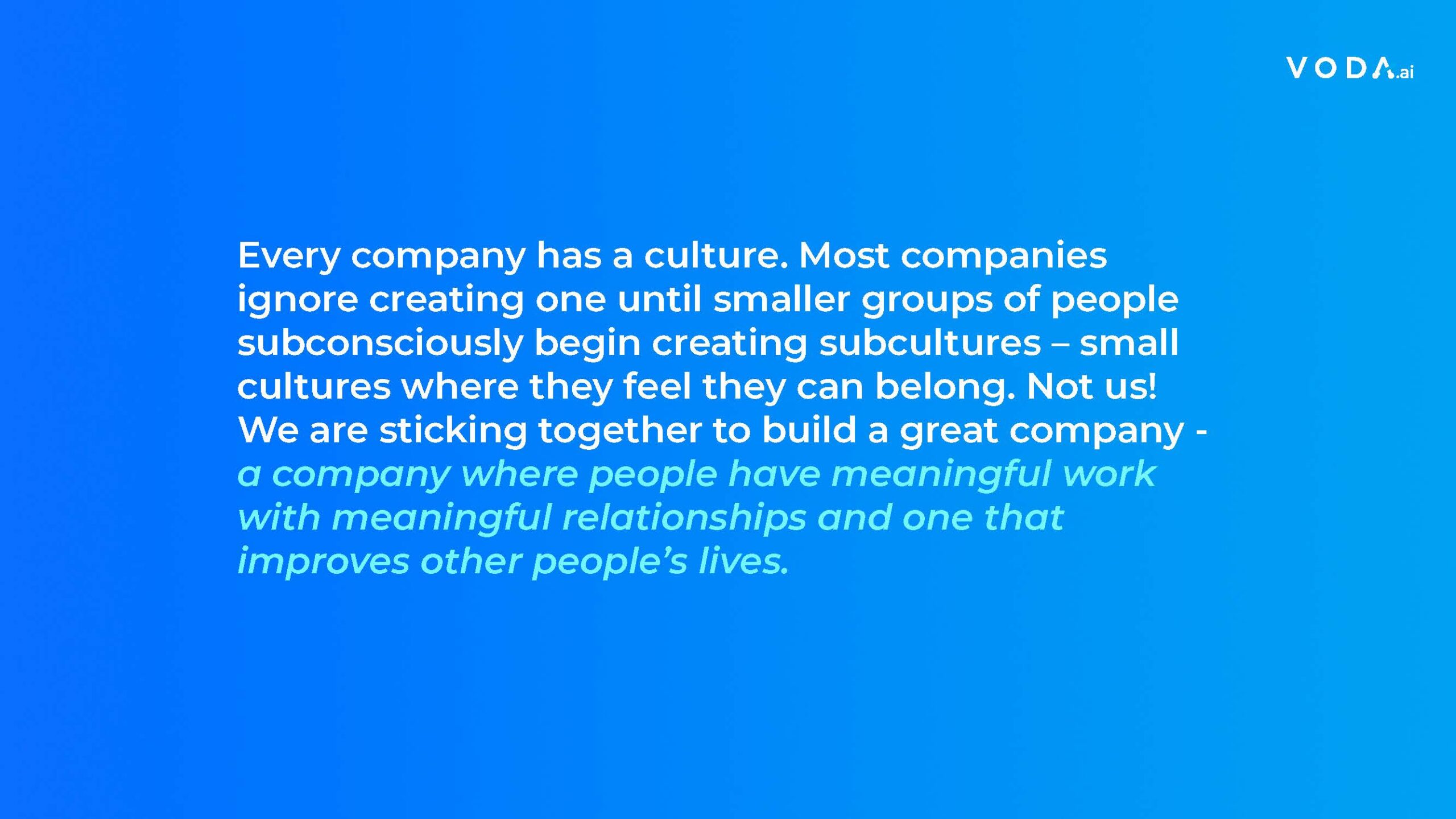 VODA.ai is a company where people have meaningful work with meaningful relationships and one that improves other people’s lives. This is our definition of a great company.