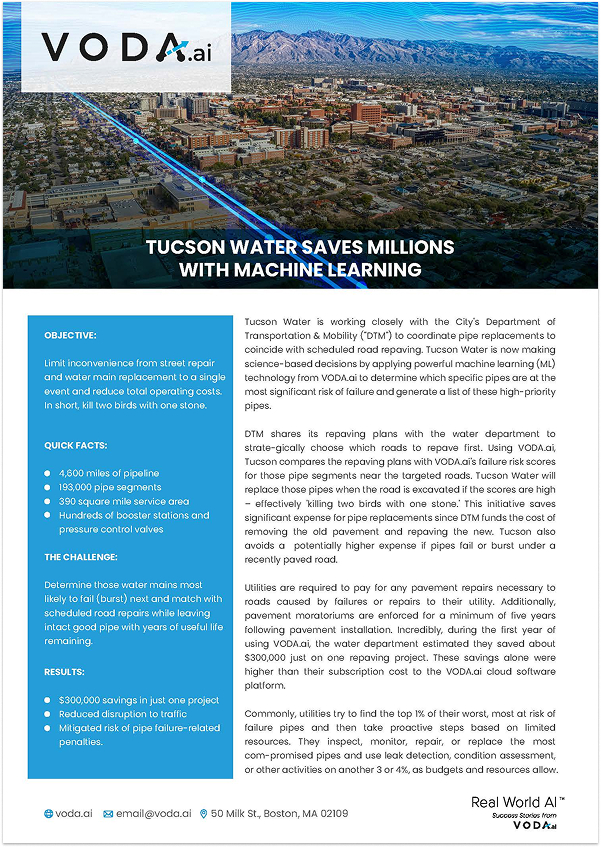 Utilities of all sizes are using VODA.ai to make smarter decisions. By prioritizing the right projects at the right time, they’re replacing less pipe, reducing risk and emergency repairs, as well as extending asset life.
